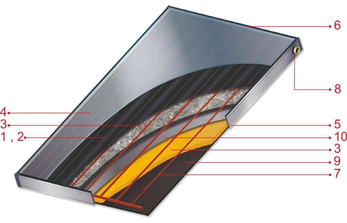 Пластина поглотителя состоит из высоко-качественой меди, приваренной к медным надстрочным элементам, которые обеспечивают превосходную передачу теплоты между ними, гарантируя высокую эффективность. Превосходная селективность обеспечивает высокое поглощение 95% при чрезвычайно низкой эмиссии.